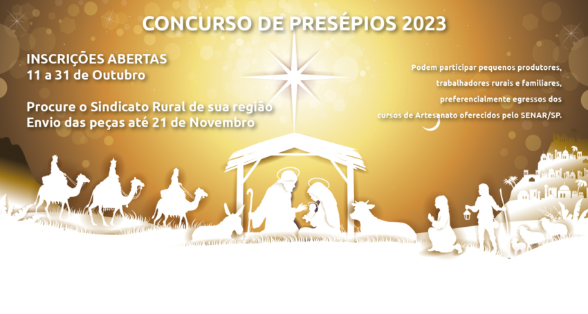O Concurso de Presépios realizado no ano passado foi um sucesso, e agora em 2023 o Senar-SP repete a experiência, convidando pequenos produtores, trabalhadores rurais e familiares de todo o Estado de São Paulo a participar representando os Sindicatos Rurais ligados ao Sistema Faesp/Senar-SP. As inscrições para o concurso já estão abertas e os artistas que quiserem participar devem procurar o Sindicato Rural mais próximo, e é o sindicato que fará a inscrição do artista através deste link: https://forms.office.com/r/ux88PuPXUw