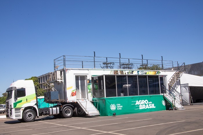 Com 98 metros quadrados de área útil, a carreta Agro pelo Brasil conta com espaços fixos e modulares, oferecendo palestras, estrutura para gravação de podcasts, além de projeções de vídeos e sons que retratam a diversidade e a força do setor agropecuário brasileiro.