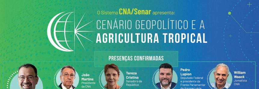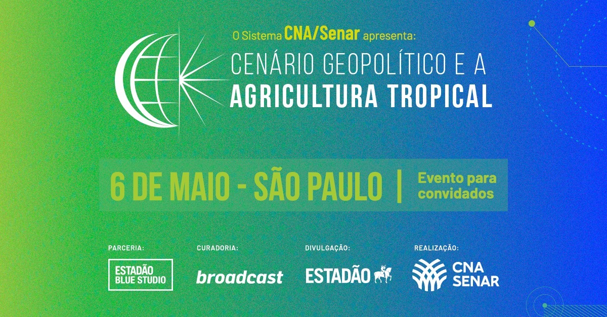 Brasília (28/04/2025) – O Sistema CNA/Senar, em parceria com o Estadão e a Broadcast, promove, no dia 6 de maio, em São Paulo, o evento “Cenário Geopolítico e a Agricultura Tropical”.