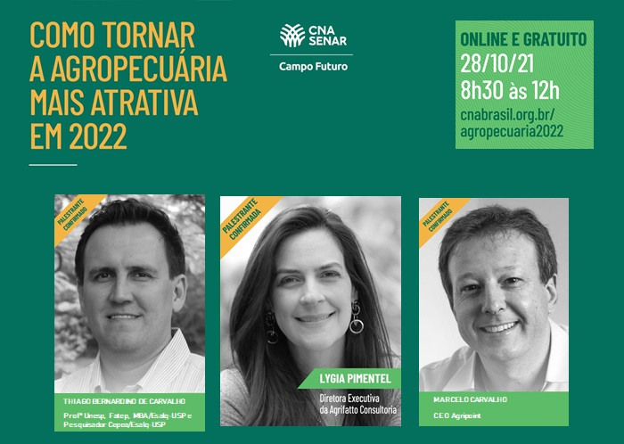 Brasília (25/10/2021) – O Sistema CNA/Senar realiza, na quinta (28), o evento virtual “Como tornar a agropecuária mais atrativa em 2022” com painéis de debates e com a apresentação dos principais resultados dos custos de produção da agropecuária coletados pelos técnicos do Projeto Campo Futuro ao longo do ano.