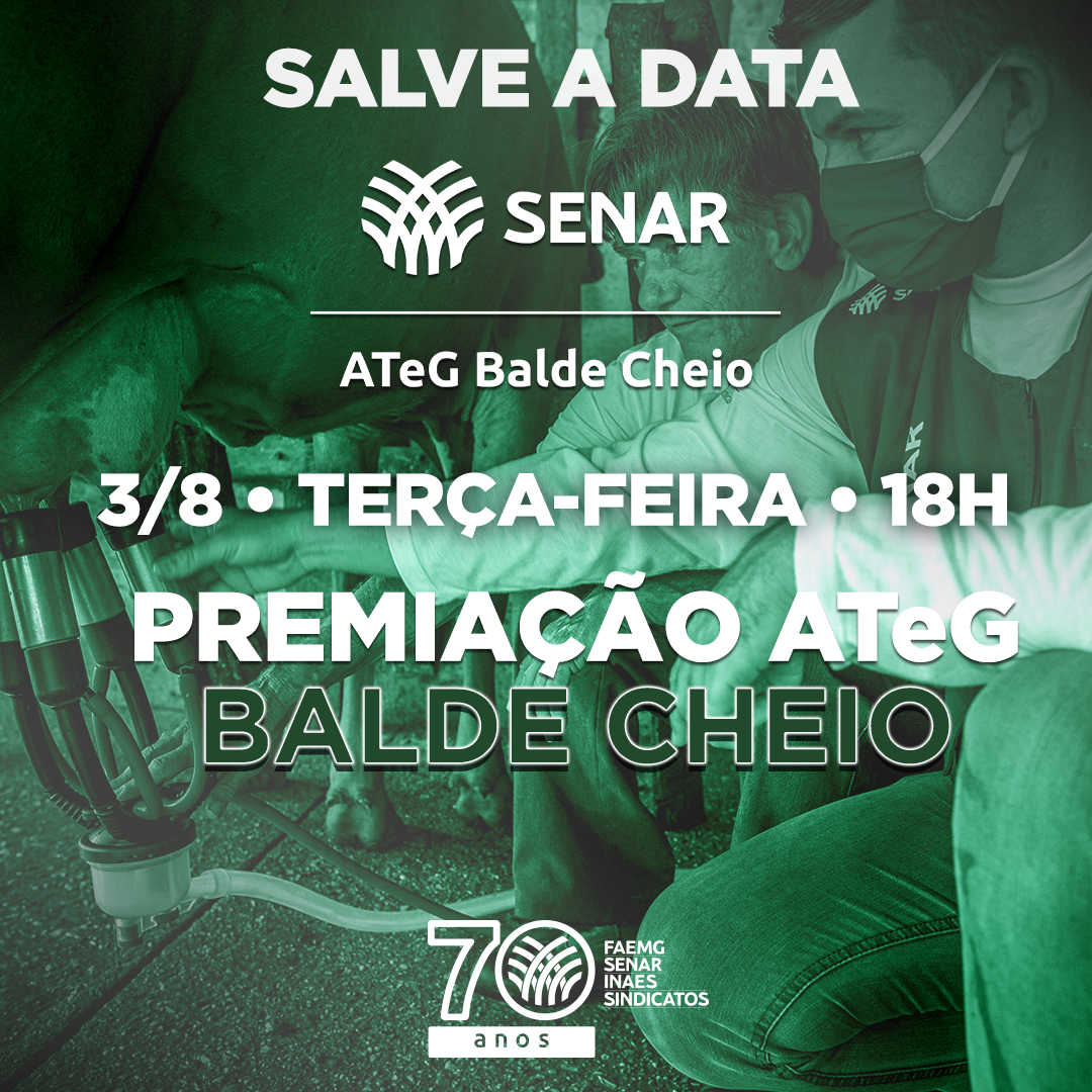O Programa de Assistência Técnica e Gerencial do Sistema FAEMG/SENAR/INAES encerra mais um ciclo em grande estilo: em 3 de agosto, 21 produtores de leite serão agraciados durante solenidade virtual na Premiação ATeG Balde Cheio. O evento será transmitido ao vivo pelo canal do Sistema FAEMG no YouTube, a partir das 18h.