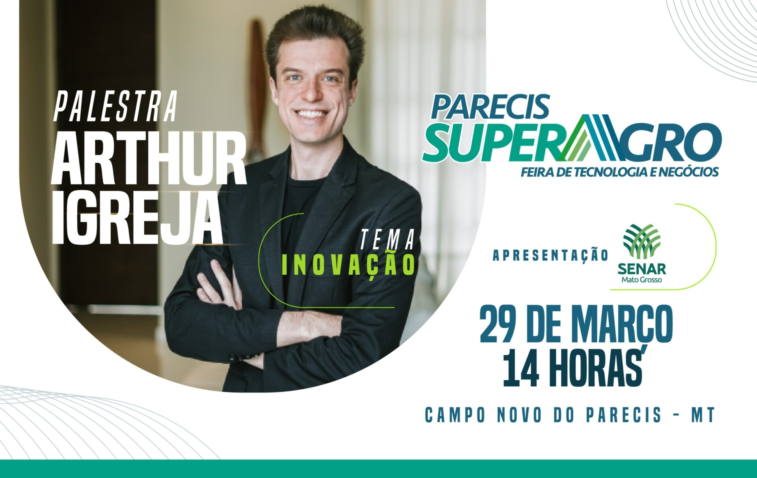 O Senar-MT também está ofertando a palestra com Arthur Igreja que falará sobre Inovação. Igreja é um palestrante com mais de 150 eventos por ano, autor de livros e profissional conceituado em assuntos como transformação digital e tecnologia. A palestra está programada para a quarta-feira (29.03), às 14h.