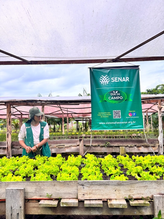 Brasília (16/04/2025) - A técnica de campo do Serviço Nacional de Aprendizagem Rural (Senar), Bruna da Silva Simas, de Parintins (AM), está unindo teoria e prática para impulsionar a produtividade na olericultura (cultivo de hortaliças) na região.