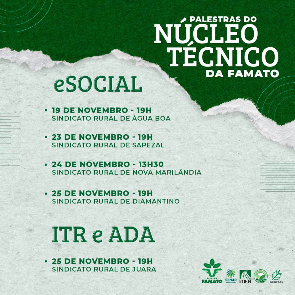 Analistas do Núcleo Técnico da Federação da Agricultura e Pecuária de Mato Grosso (Famato) percorrerão, entre os dias 19 e 25 de novembro, os municípios de Água Boa, Sapezal, Nova Marilândia, Diamantino e Juara levando palestras orientativas sobre Imposto Territorial Rural (ITR), Ato Declaratório Ambiental (ADA) e Sistema de Escrituração Digital das Obrigações Fiscais, Previdenciárias e Trabalhistas (eSocial). As palestras acontecerão nos sindicatos rurais dos respectivos municípios.