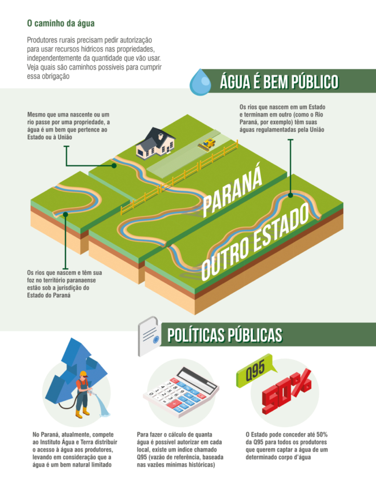 Imprescindível para qualquer propriedade rural, a água é utilizada para matar a sede dos seres humanos e animais, criar peixes, fazer irrigação, lavar alimentos antes de serem comercializados, entre outras atividades. Para o uso do recurso, os proprietários, independentemente da quantia, precisam pedir autorização ao Estado ou União para captar água. Pela Constituição Federal, toda água, seja superficial (rios, lagos, nascentes, fontes e outros) ou subterrânea (poços) pertence ao governo Estadual ou à União. Os rios que nascem em um Estado e terminam em outro são do governo federal. Os que nascem e terminam no mesmo Estado são do governo estadual.