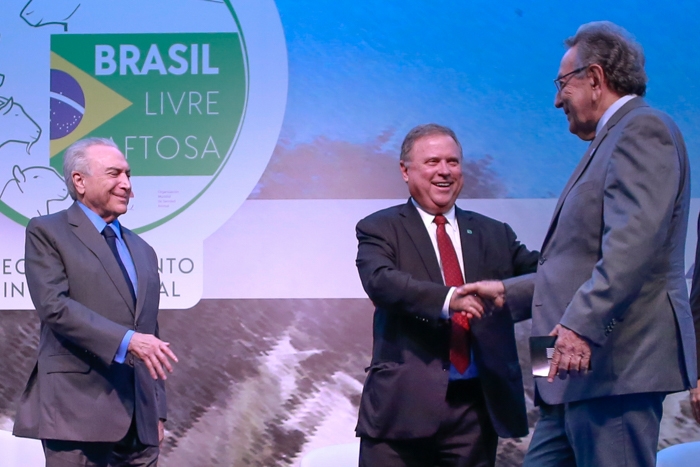 Já o ministro Blairo Maggi informou que o país receberá o certificado de status de país livre da febre aftosa com vacinação em maio, em Paris, durante a reunião da Organização Mundial de Saúde Animal (OIE).