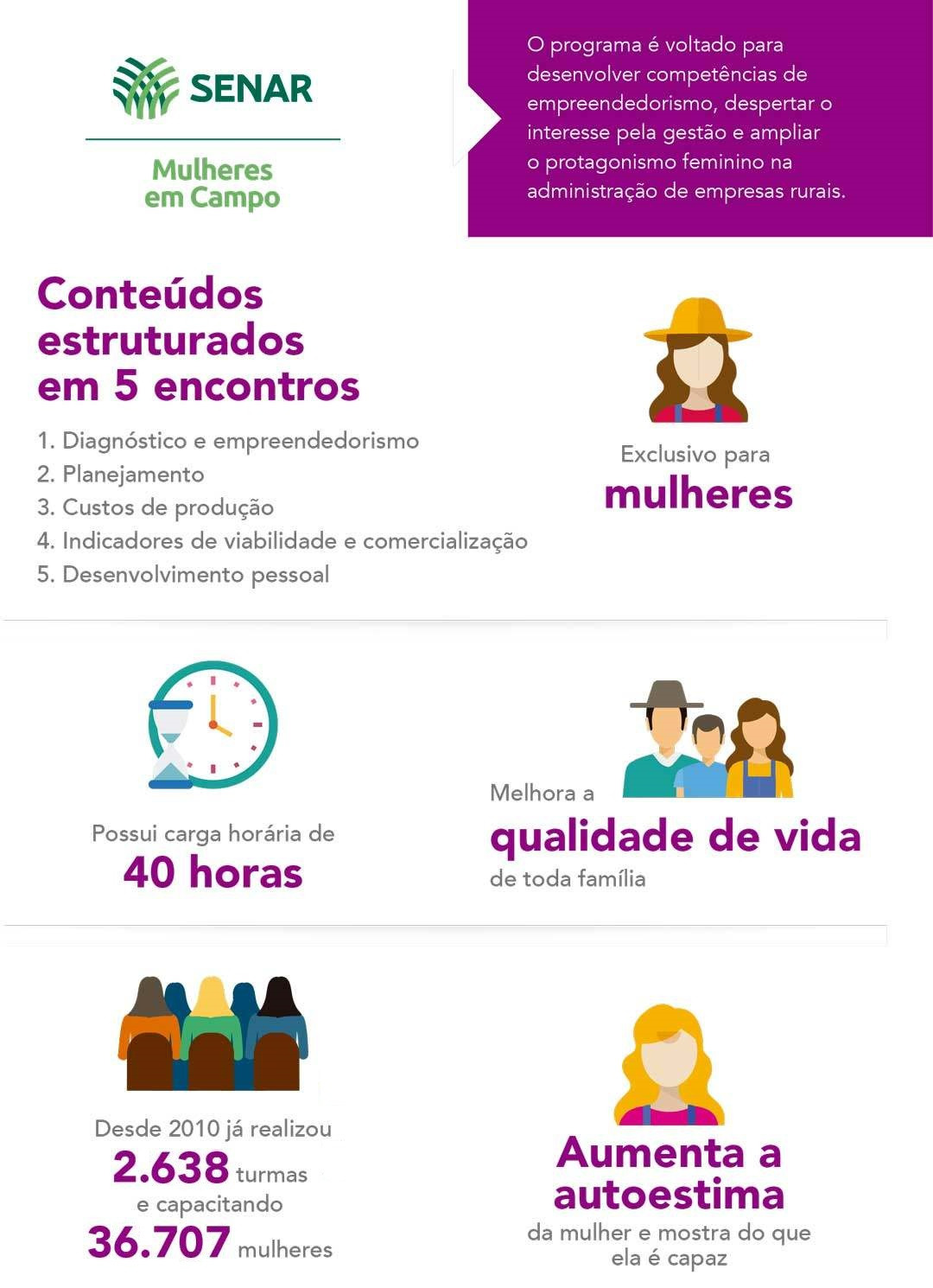 O programa desenvolve competências de empreendedorismo e gestão, orienta na descoberta do potencial de cada participante e da propriedade, ensina a planejar e a transformar uma atividade em negócio.
