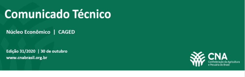A agropecuária segue sendo o setor de atividade econômica que mais abriu vagas em 2020, com saldo positivo de 102.467 novas vagas de janeiro a setembro/2020. No mesmo período, o setor da construção civil abriu 102.108 vagas e da indústria 689 vagas. Serviços (-418.040) e Comércio (-345.677) fecharam postos em 2020. No total, o Brasil acumula fechamento de 558.597 postos de trabalho nos 9 primeiros meses do ano.