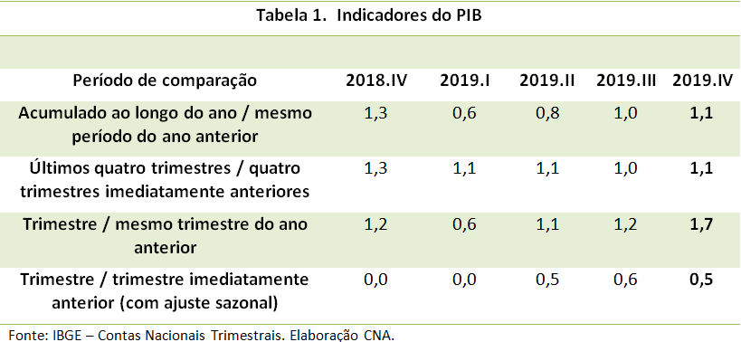 Divulgado hoje pelo Instituto Brasileiro de Geografia e Estatística (IBGE), o Produto Interno Bruto (PIB) do País em 2019 apontou crescimento de 1,1% no acumulado do ano, um desempenho inferior tanto ao observado nos últimos 2 anos - quando o crescimento foi de 1,3% - como à expectativa inicial de crescimento para o ano que era de 2,5%. A tabela 1 a seguir mostra o desempenho da economia brasileira ao longo de 2019, e o gráfico 1 a comparação de desempenho entre os setores de atividade econômica.