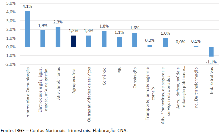 Além da agropecuária (1,3%), cresceram mais que a média nacional de 1,1% nos últimos 12 meses, os seguintes setor: Informação e Comunicação (4,1%), Atividades Imobiliárias (2,3%), Eletricidade, água e esgoto (1,9%) e Comércio (1,8%). Outras Atividades e Serviços, tiveram crescimento no mesmo ritmo que o agro (1,3%). A indústria extrativa foi a única a encolher (-1,1%).