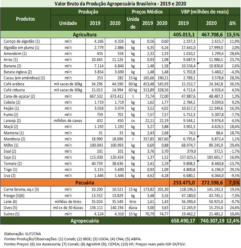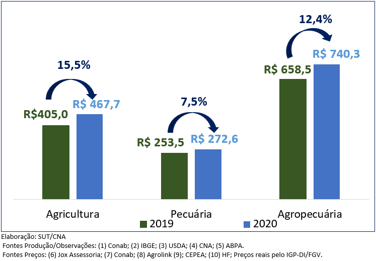 Para o ramo agrícola é esperado um crescimento de 15,5%, com produção chegando a R$ 467,7 bilhões em 2020. O resultado reflete, principalmente, a alta de preços e produção de produtos como soja (4,7% e 11,7% respectivamente), arroz (6,5% e 16,2%) e café arábica (30% e 20,4%), somada a alta de preços do milho (28,2%) e de produção da laranja (4,2%).