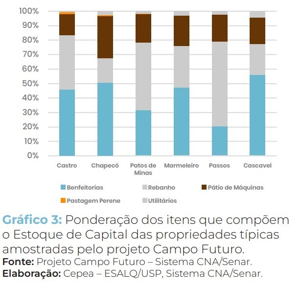 A manutenção de um sistema produtivo exige investimentos para estruturar suas operações. O capital alocado em infraestrutura, cultivo de áreas perenes e animais, exerce influência sobre a margem líquida obtida, devido aos custos com depreciação, devendo a atividade gerar caixa suficiente para garantir a reposição da infraestrutura. Portanto, o produtor de leite deve tomar a decisão estratégica de onde alocar seus recursos de forma a elevar seus retornos financeiros.