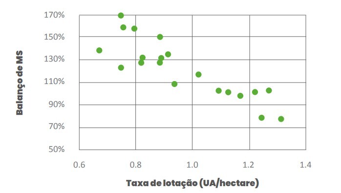 Ao correlacionar o balanço de MS com a taxa de lotação apresentada pelo sistema, ficou evidente que propriedades que se encontravam em déficit de produção de MS demonstravam tendência de apresentar taxa de lotação (UA/ hectare) mais alta (Gráfico 2). Em contrapartida, propriedades em superávit de produção de MS tendiam a taxas de lotação mais baixas.