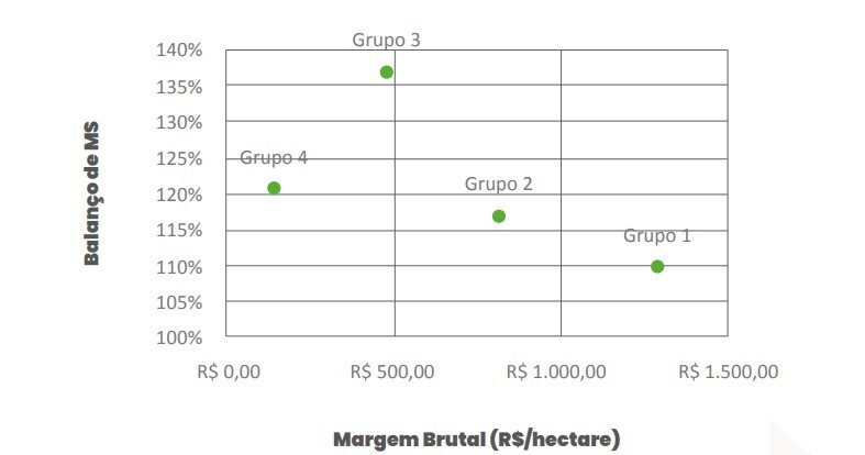Ao correlacionar a MB por hectare com o balanço de MS, observou-se que os grupos 1 e 2 obtiveram as MB mais altas e, também, um balanço de MS mais próximo do ideal (faixa de 100%). Por outro lado, os grupos 3 e 4, além de apresentarem as MB menores, demonstraram um balanço de MS com maior excedente de forragem (Gráfico 3).