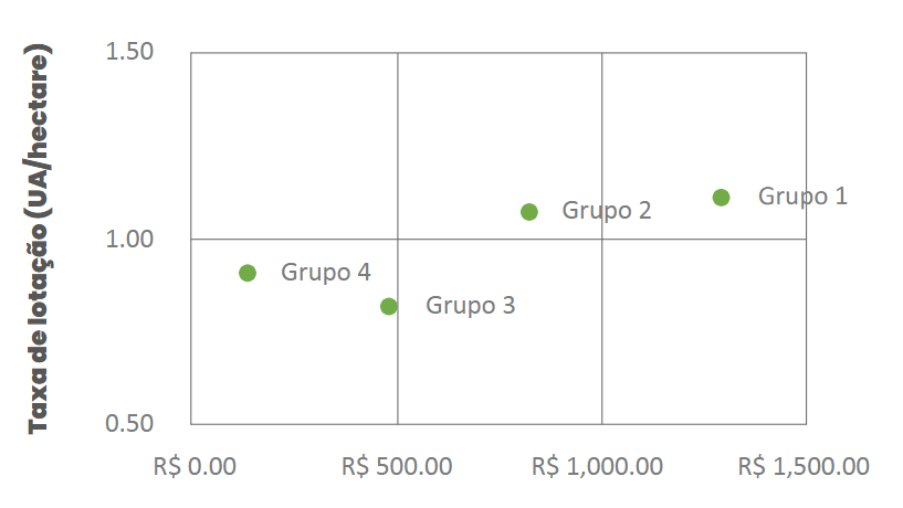 Diante dos resultados observados, nota-se que os grupos 1 e 2 conseguiram manter taxas de lotações relativamente mais altas (acima de 1 UA/ha) sem comprometer o desempenho individual dos animais. Enquanto os grupos 3 e 4 operaram com lotações mais baixas e apresentaram GMD significativamente inferiores.