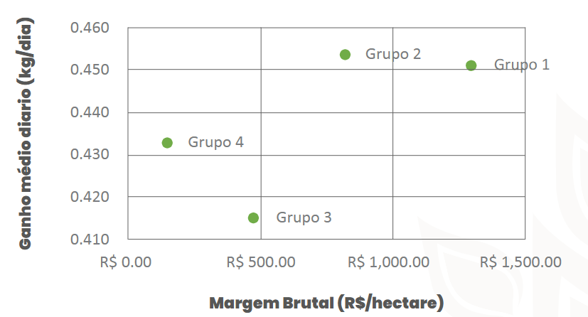 Para analisar a relação entre a gestão produtiva e o resultado financeiro dos sistemas, as propriedades foram agrupadas de acordo as margens brutas (MB) obtidas. Assim, as 20 propriedades presentes na análise foram distribuídas em quatro grupos. O grupo 1 representa as 25% com as maiores MB (R$/hectare), enquanto o grupo 4 corresponde aos 25% com as MB (R$/hectare) mais baixas.