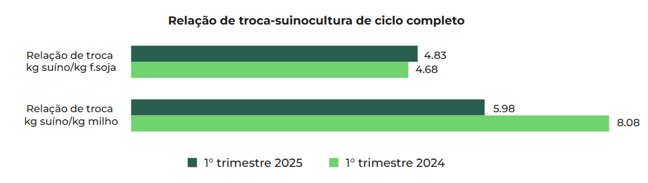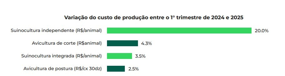 A Figura 1 apresenta a variação percentual dos custos de produção entre suinocultura de ciclo completo, suinocultura integrada (inclui as unidades produtoras de desmamados, leitões e terminados), avicultura de postura e de corte entre o 1º trimestre de 2024 e 2025. Observa-se maior impacto na suinocultura de ciclo completo, evidenciando sua maior sensibilidade às oscilações nos custos, em especial com a alimentação dos animais.