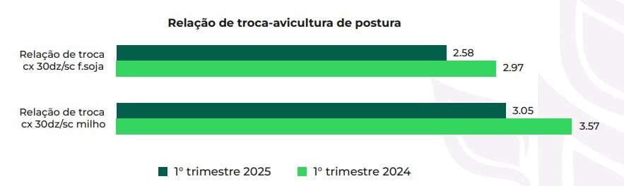 A Figura 2 ilustra a evolução da relação de troca entre o preço da caixa de 30 dúzias de ovos e os valores do farelo de soja e do milho — principais componentes da alimentação na avicultura de postura. No primeiro trimestre de 2025, observou- -se uma retração de 13,2% no poder de compra em relação ao farelo de soja e de 14,6% frente ao milho, em comparação com o mesmo período do ano anterior. Esse movimento evidencia a pressão crescente sobre os custos de produção, que não foi compensada pelo aumento nos preços dos ovos no mercado. Na prática, mesmo com uma receita mais alta, a elevação proporcionalmente maior dos insumos essenciais para formulação da ração resultou em uma compressão das margens da atividade, exigindo atenção redobrada à gestão de custos por parte dos produtores.