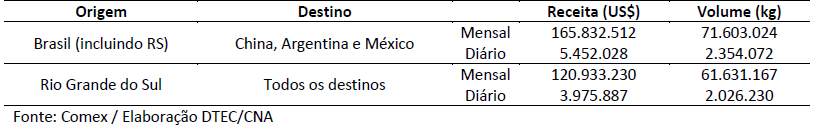 Na Tabela 1, apresentamos as receitas e volumes referentes as exportações brasileiras de carne de frango em 2023 (dados consolidados).