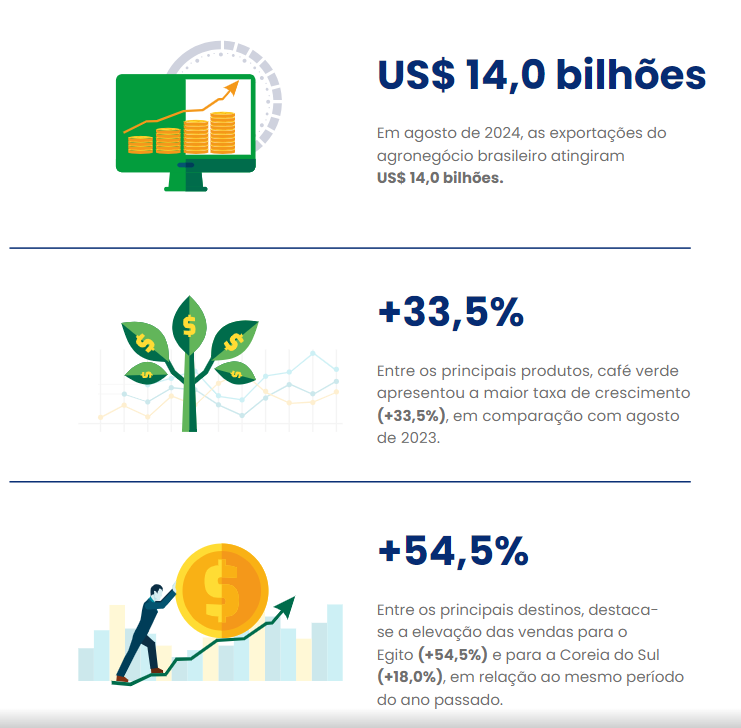 Em agosto de 2024, as exportações do agronegócio brasileiro atingiram US$ 14,0 bilhões.