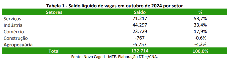 A economia brasileira criou 132.714 novos postos de trabalho em outubro de 2024, segundo Novo Cadastro Geral de Empregados e Desempregados (Novo Caged) do Ministério do Trabalho e Emprego (MTE). O saldo é resultado de 2.222.962 admissões e 2.090.248 demissões no período.