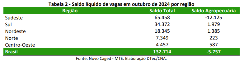 Em outubro, todas as regiões apresentaram saldo positivo, quando avaliado o total de empregos da economia. O Sudeste destacou-se com a maior criação de vagas (65.458 vagas). Na sequência, ficaram o Sul (34.372) e o Nordeste (18.345 postos). Norte e Centro-Oeste registraram 7.349 e 4.457 vagas, respectivamente. Quanto ao saldo da Agropecuária, todas as regiões apresentaram saldo positivo, à exceção do Sudeste, que registrou perda líquida de 12.125 postos. A região Sul teve o maior destaque no setor em outubro, com a criação de 1.979 novos empregos, seguida pelo Nordeste (1.385), Centro-Oeste (587) e Norte (223).