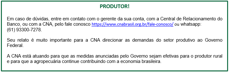 Após a publicação da Resolução 4.801, a CNA encaminhou ofício à Ministra da Agricultura, Pecuária e Abastecimento informando que as medidas previstas na Resolução atendem parcialmente às solicitações encaminhadas pela CNA para apoio ao produtor para superar os impactos causados pela pandemia do corononavírus e manter a produção.