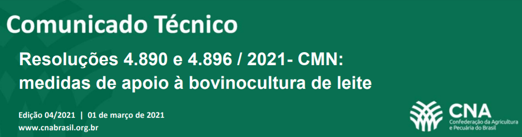 No dia 26 de fevereiro de 2021, o Conselho Monetário Nacional (CMN) aprovou as Resoluções 4.890 e 4.896, com duas medidas de apoio à bovinocultura de leite, que tem como objetivo auxiliar na mitigação dos impactos da crise no setor, em função dos elevados custos de produção e queda no preço do leite.