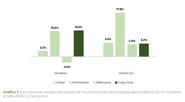 Com projeções de alta de 5,32% durante o período de safra no Centro-Sul e 4,60% no Nordeste, o IPCA tende a elevar os custos relacionados à mão de obra e demais serviços ligados ao indicador. O diesel segue como um insumo de alta relevância, especialmente para regiões que dependem fortemente da mecanização como o Centro-Sul, podendo elevar os custos operacionais, com projeção de aumento de 5,51% no Centro-Sul e 2,16% no Nordeste.