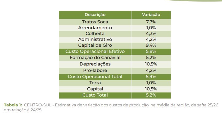 Para a safra 2025/2026, é esperado que os custos de produção continuem pressionados pelos mesmos fatores observados na safra anterior. O comportamento da produtividade continuará sendo um elemento crítico na determinação do custo unitário da cana, podendo impactar significativamente a margem de lucro dos produtores.