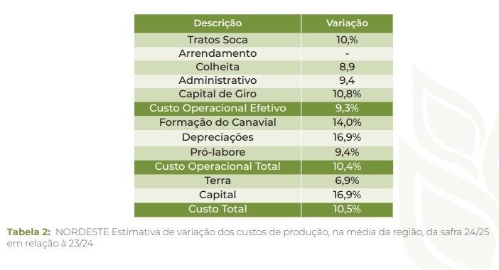 Entre as safras, a inflação medida pelo IPCA impactou diretamente os custos de mão de obra, elevando os gastos com operações no campo. O aumento nos preços do diesel também afetou significativamente os custos operacionais, já que a mecanização é altamente dependente desse insumo. No Centro-Sul o custo operacional efetivo se estabilizou em 2024 (+0,5%). No Nordeste, o mesmo apresentou crescimento de 3,9% para 2023.