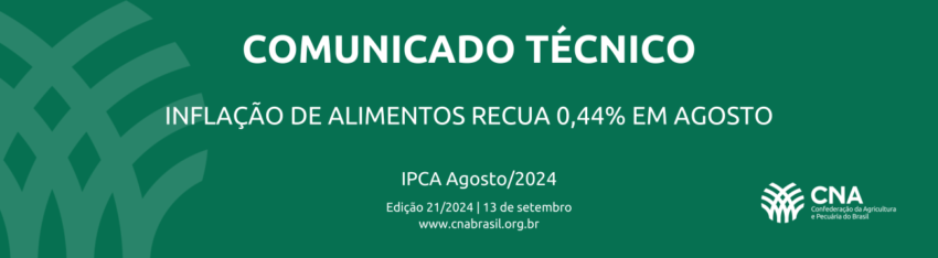 A Inflação, medida pelo Índice de Preços ao Consumidor Amplo (IPCA), apresentou queda de 0,02% em agosto de 2024, ficando 0,40 p.p. abaixo do registrado em julho de 2024. O IPCA acumulado nos últimos 12 meses apresenta alta de 4,24%, abaixo do limite superior do teto da meta para 2024, de 3,00%, com tolerância de 1,5 p.p. para cima ou para baixo.