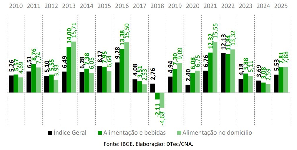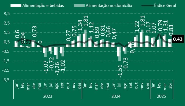 No acumulado dos últimos 12 meses até abril, o índice geral registrou aumento de 5,53%, com o grupo Alimentação e bebidas apresentando alta de 7,81% e Alimentação no domicílio, de 7,88%.