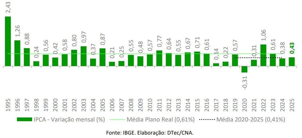 O Índice Nacional de Preços ao Consumidor Amplo (IPCA) foi de 0,43% em abril de 2025, ficando 0,13 p.p. abaixo do registrado em março, que apresentou aumento de 0,56%. Em abril de 2024, o índice apresentou aumento de 0,38%. Quando observado a média histórica para o mês, abril de 2025 ficou abaixo do resultado dos últimos cinco anos (0,43%).