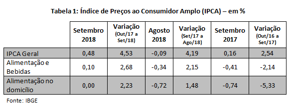 O Instituto Brasileiro de Geografia e Estatística (IBGE) divulgou alta de 0,48% no Índice de Preços ao Consumidor Amplo (IPCA) de setembro/2018 na data de 05 de outubro. No último mês de agosto, o índice havia apresentado queda de -0,09%. A inflação registrada no mês de setembro veio acima das expectativas de mercado, que apontava estimativas de crescimento entre 0,28% e 0,48%, com mediana de 0,44%, segundo Projeções Broadcast - pesquisa realizada com 50 instituições em 03 de outubro.