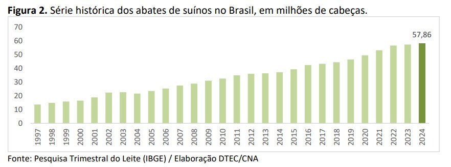 Os abates de suínos cresceram 0,9% no Brasil no último trimestre de 2024, na comparação anual, com 14,27 milhões de cabeças abatidas entre outubro e dezembro.
