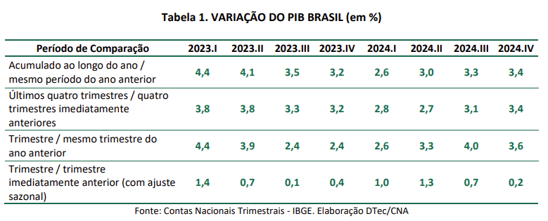 O Produto Interno Bruto (PIB) brasileiro registrou crescimento de 0,2% no quarto trimestre de 2024 em relação ao trimestre imediatamente anterior, segundo dados das Contas Nacionais Trimestrais do Instituto Brasileiro de Geografia e Estatística (IBGE). O resultado ficou bem abaixo dos registrados nos trimestres anteriores, com destaque para o segundo trimestre, que teve alta de 1,3%. Com isso, o PIB do país encerrou 2024 com crescimento de 3,4%, totalizando R$ 11,7 trilhões.