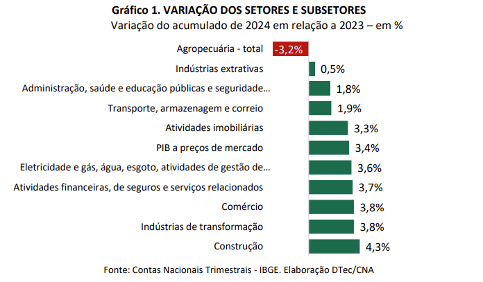 Do lado do recuo, destaca-se a Agropecuária, que teve retração de 3,2% por conta das adversidades climáticas. O gráfico 1 apresenta os resultados do PIB dos setores e subsetores, considerando a variação acumulada de 2024 em relação a 2023.