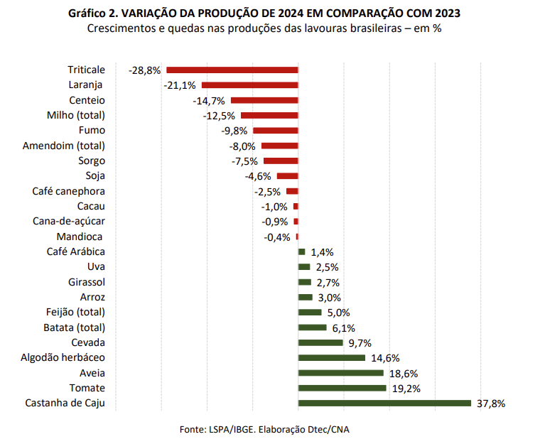 Segundo a Companhia Nacional de Abastecimento (Conab), a produção total de grãos atingiu 297,7 milhões de toneladas na safra 2023/24, uma redução de 7,2% em relação à safra 2022/23, quando alcançou 320,9 milhões de toneladas. A colheita do milho foi a mais impactada. A área plantada dessa cultura foi reduzida em 5,5% em 2024, na comparação com 2023, e sua produtividade caiu 7,2%. Como resultado, a produção de milho apresentou queda de 12,3% na mesma base de comparação. A soja, por sua vez, registrou crescimento na área plantada (3,9%), mas sofreu recuo na produtividade (-8,8%), levando a uma queda de 5,1% na produção total da oleaginosa. As quedas de produção previstas pela Conab vão ao encontro das estimativas anuais do Levantamento Sistemático da Produção Agrícola (LSPA) do IBGE, que estimam perdas de 12,5% e 4,6% nas produções de milho e soja, respectivamente.