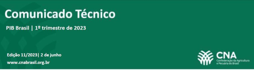 O Produto Interno Bruto (PIB) do Brasil registrou crescimento de 1,9% no primeiro trimestre de 2023, na comparação com o quarto trimestre de 2022, totalizando R$ 2,6 trilhões no período. O resultado foi fortemente impulsionado pelo setor agropecuário, que apresentou crescimento de 21,6%, sendo a maior alta desde o quarto trimestre de 1996.