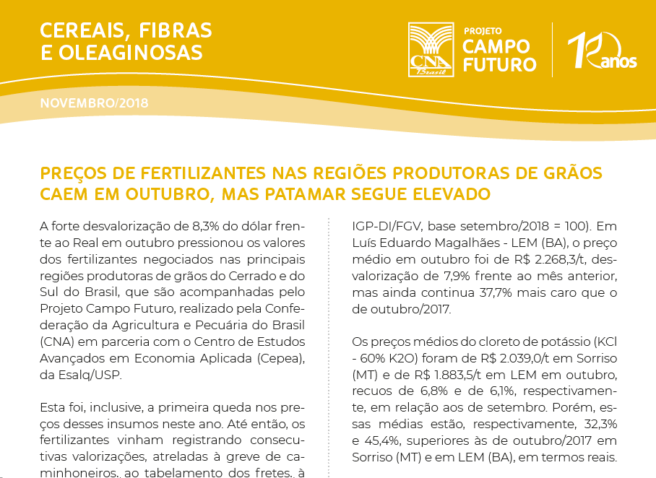 A forte desvalorização de 8,3% do dólar frente ao Real em outubro pressionou os valores dos fertilizantes negociados nas principais regiões produtoras de grãos do Cerrado e do Sul do Brasil, que são acompanhadas pelo Projeto Campo Futuro, realizado pela Confederação da Agricultura e Pecuária do Brasil (CNA) em parceria com o Centro de Estudos Avançados em Economia Aplicada (Cepea), da Esalq/USP. Veja análise completa.
