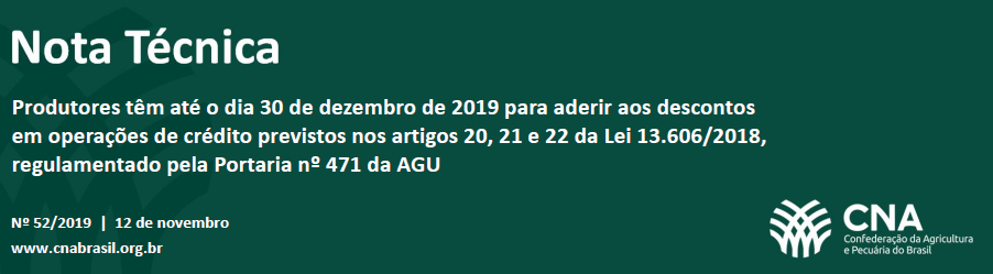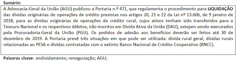 A Advocacia-Geral da União (AGU) publicou a Portaria 471 que regulamenta o procedimento para LIQUIDAÇÃO das dívidas originárias de operações de crédito previstas nos artigos 20, 21 e 22 da Lei nº 13.606, de 9 janeiro de 2018, para as dívidas originárias de operações de crédito rural, cujos ativos tenham sido transferidos para o Tesouro Nacional e os respectivos débitos, não inscritos em Dívida Ativa da União (DAU), estejam sendo executados pela Procuradoria-Geral da União (PGU). A portaria foi publicada em 27 de setembro de 2019.
