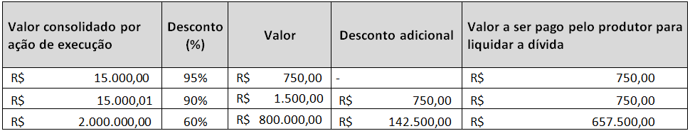 Para um valor de R$ 2.000.000,00, o desconto será de 60% mais o adicional de R$ 142.500,00, e o valor a ser pago pelo produtor para liquidar sua dívida será de R$ 657.500,00. Esses exemplos estão demonstrados na Tabela 1.