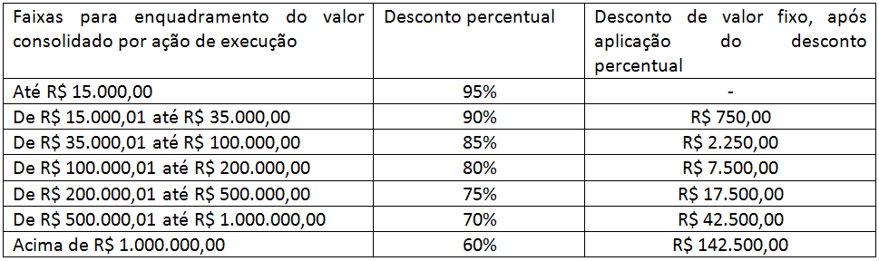 a) permissão de descontos (percentuais), conforme quadro abaixo, a incidir sobre o valor total consolidado do débito, atualizado até a data da liquidação, considerando a respectiva faixa de valor do crédito;