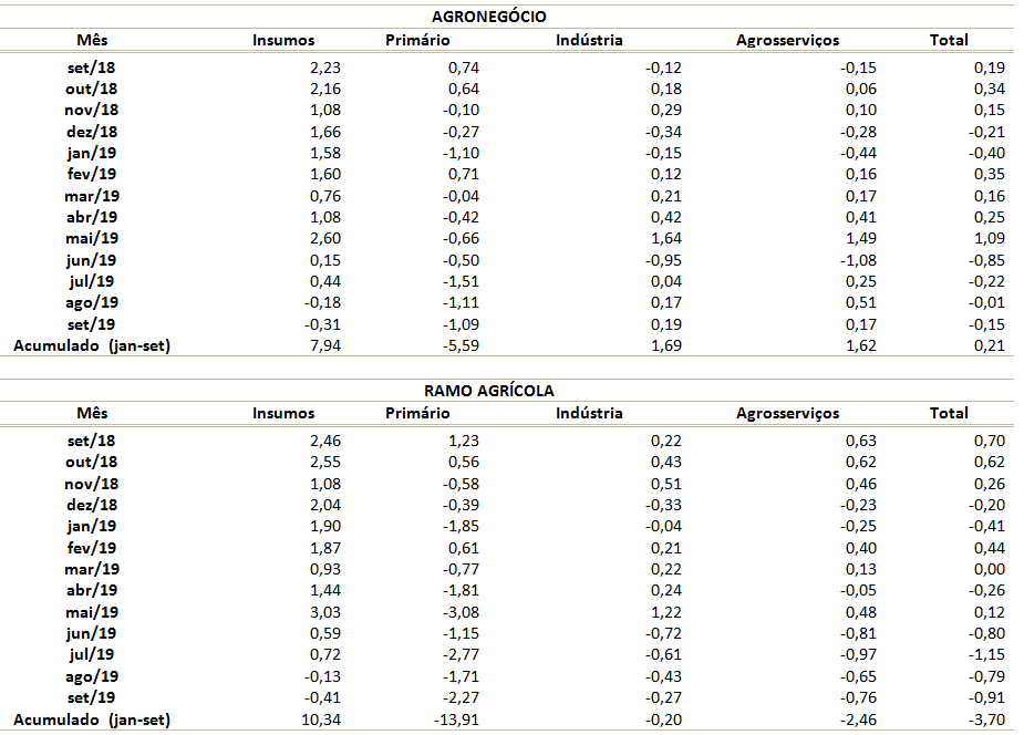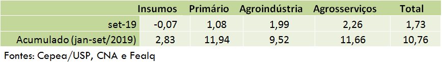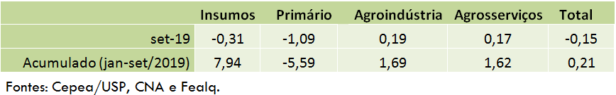 Entre os segmentos do agronegócio, agroindústria (0,19%) e agrosserviços (0,17%) registraram pequenas elevações em setembro, com recuo no segmento primário (-1,09%) e no de insumos (-0,31%). Já no acumulado de 2019 (janeiro a setembro), insumos (7,94%), agroindústria (1,69%) e agrosserviços (1,62%) cresceram, enquanto o segmento primário seguiu registrando baixa (-5,59%) - Tabela 1.