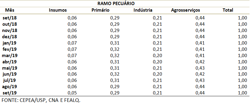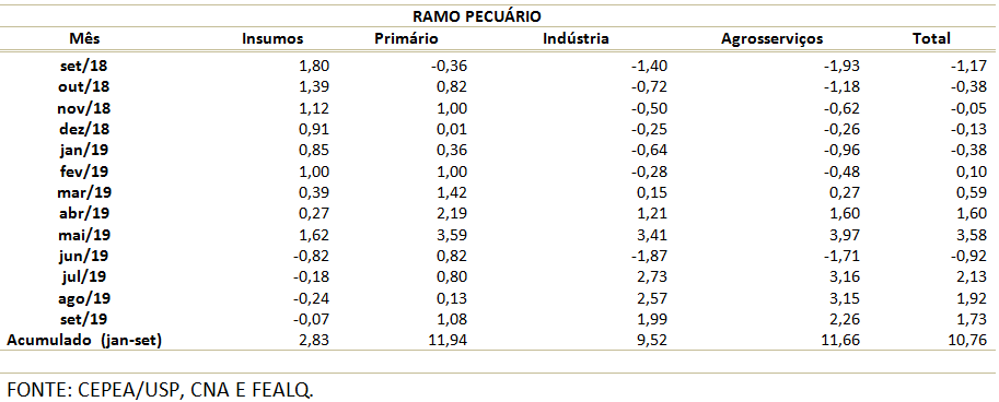 No ramo pecuário, seguindo a tendência dos últimos meses, houve aumento do PIB de 1,73% em setembro. Então, registrou-se crescimento expressivo de 10,76% no acumulado dos primeiros nove meses de 2019. Em relação aos segmentos, apresentaram crescimento em setembro o primário (1,08%), a agroindústria (1,99%) e os agrosserviços (2,26%), e o segmento de insumos ficou praticamente estável no mês (-0,07%). Já no acumulado, todos os segmentos do ramo registraram altas importantes, de 2,83%, 11,94%, 9,52% e 11,66% para insumos, primário, agroindústria e agrosserviços, respectivamente – Tabela 3.