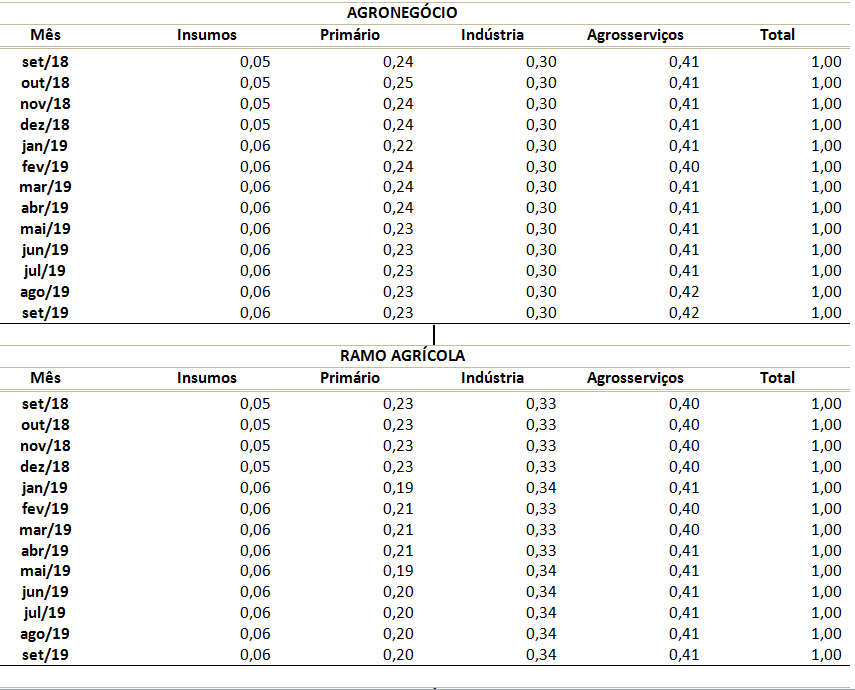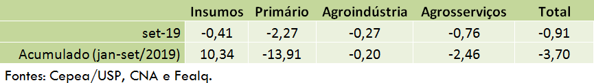 No acumulado de janeiro a setembro de 2019, verifica-se baixa de 5,59% no segmento primário do agronegócio, devido, principalmente, à queda expressiva no ramo agrícola, de 13,91%, uma vez que no ramo pecuário o segmento acumula crescimento também importante de 11,94% (Tabelas de 1 a 3).