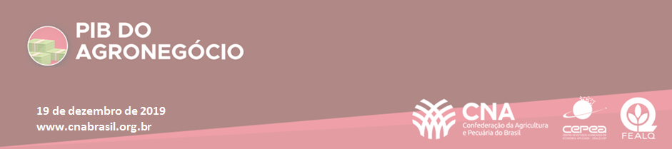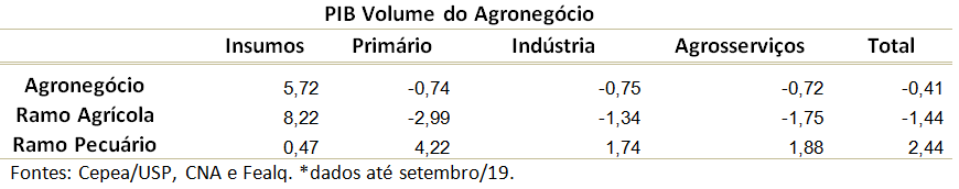 O PIB do agronegócio brasileiro acumulou crescimento de 0,21% de janeiro a setembro de 2019 refletindo, por um lado, expansão de 10,76% do PIB do ramo pecuário e, por outro, retração de 3,7% do ramo agrícola.
