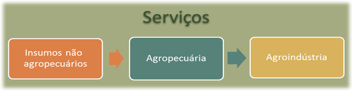 O Relatório PIB do Agronegócio Brasileiro é uma publicação mensal resultante da parceria entre o Centro de Estudos Avançados em Economia Aplicada (CEPEA), da Esalq/USP, a Confederação da Agricultura e Pecuária do Brasil (CNA) e a Fundação de Estudos Agrários Luiz de Queiroz (FEALQ). O agronegócio é entendido como a soma de quatro segmentos: insumos para a agropecuária, produção agropecuária básica (ou primária), agroindústria (processamento) e agrosserviços – como na Figura que segue. A análise desse conjunto de segmentos é feita para o ramo agrícola (vegetal) e para o pecuário (animal). Ao serem somados, com as devidas ponderações, obtém-se a análise do agronegócio.