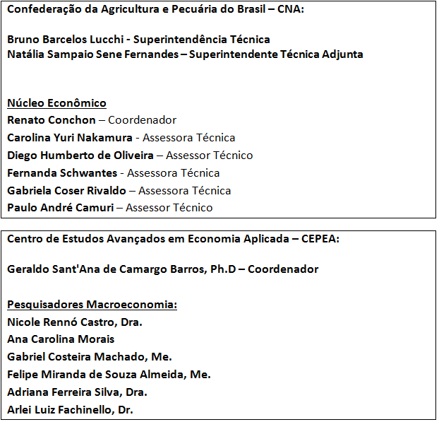 Importante também destacar que cada relatório considera os dados disponíveis – preços observados e estimativas anuais de produção – até o seu fechamento. Em edições futuras, ao serem agregadas informações mais atualizadas, há a possibilidade, portanto, de ocorrer alteração dos resultados, tanto no que se refere ao mês corrente, como também ao que se refere a meses e anos passados. Recomenda-se, portanto, sempre o uso do relatório mais atualizado. Para uma análise mais detalhada dos aspectos metodológicos, bem como dos resultados dos demais indicadores (PIB volume, Consumo Intermediário, etc.) ver http://www.cepea.esalq.usp.br/br/pib-do-agronegocio-brasileiro.aspx